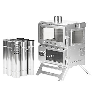 The Baker stove combines the firebox and the oven, the temperature of the firebox can be directly transferred to the interior of the oven below, so that the temperature of the oven can easily reach 200 ° C / 400 ° F, and the highest temperature can reach 260 ° C / 500 ° F. The glass on the front door and the glass on both sides can make the heat radiation from the firebox transfer to the tent interior more quickly, so that the temperature inside the tent can rise faster.