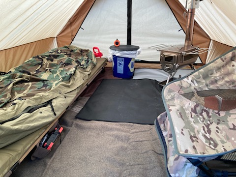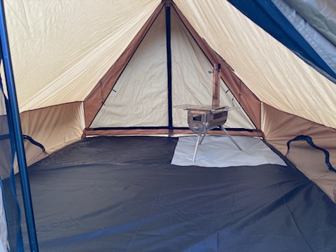 There is space for two in the Chalet 70 Pro, but with a stove, chair and gear its more practical for one person. The mesh doors and side zipper give you plenty of air flow. I did have some condensation in the mornings, but it was minimal. The tent pegs are heavy duty and longer than most, but POMOLY does not include enough stakes to accommodate the stake out points on both long side of the tent or the loops at the base of the solid door panels. (see photos) There are also loops at the center point on the door ends. But without instructions, it's unclear whether those are meant to harness and stabilize the poles or accommodate a low profile stake to further stabilize the bathtub floor. (??)