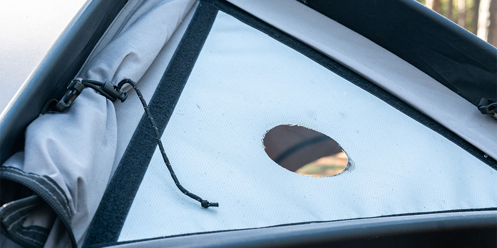 The integrated stove jack makes the surface of the tent more flat, the triangular cloth (rain cover) with zipper can completely cover the stove jack, and the small plackets on both sides can prevent rainwater from touching the zipper.