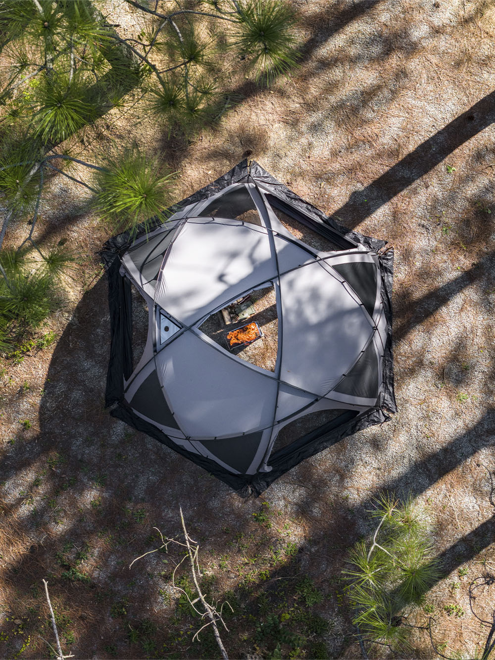 The triangular window at the top of the Dome X6 TC tent is designed for a fire pit; simply open the two zippers at the top, and you can place a fire pit in the center.